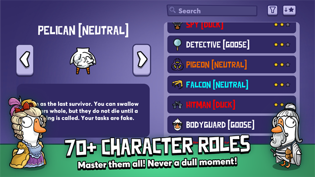 45+ 可选择角色,包括鸵鸟,刺客,加拿大鹅,食鸟鸭,呆呆鸟,通灵等等等等!