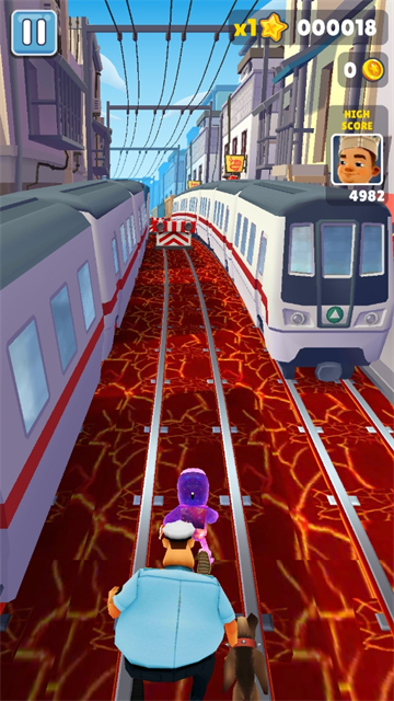 地铁跑酷可以说是一款非常经典的跑酷类游戏了,同时这款跑酷游戏也是拥有很多个不同版本才会一直流行到现在。此次小编给大家带来的:地铁跑酷岩浆定制版,是由游戏玩家自制魔改而来的,游戏中加入了岩浆元素!往常的地铁轨道变为了烫脚的岩浆跑道,金币也变成了岩浆金币,完美展现了岩浆的特点,彷佛置身在火焰山中跑酷一样,但不一样的地图场景却更能带给玩家全新的乐趣。改版来的游戏玩法与往常正式版并没有差别,玩家们需要通过控制跳跃、下滑、左右移动来对人物进行跑酷操作,在躲避对你驶来的火车以及各种障碍物的同时还要摆脱警察的追捕,游戏场景内还有众多道具可以使用比如飞行器、滑板、跳跳鞋等,合理的运用道具获取更高的分数霸榜排行榜,喜欢这个版本的小伙伴欢迎前来本站下载体验。