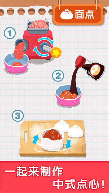 来做松饼咯,先处理香蕉、牛油果,加入牛奶鸡蛋等搅拌均匀。将面饼小火煎熟,淋上巧克力酱,别忘记加酸甜草莓装饰!接着制作皮薄馅大的中式面点:肉包,这可充分考验宝宝的小手灵活度。