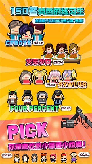 偶像天团养成记现已改名为星光创造营,是一款模拟像素风的商务之旅游戏,这个游戏的目标是建立一个著名的偶像团体。在这里你需要建立你最喜欢的偶像组合,你可以通过专辑、安排和演唱会来收获歌迷并增加你的名气,从而获得更多的利润。