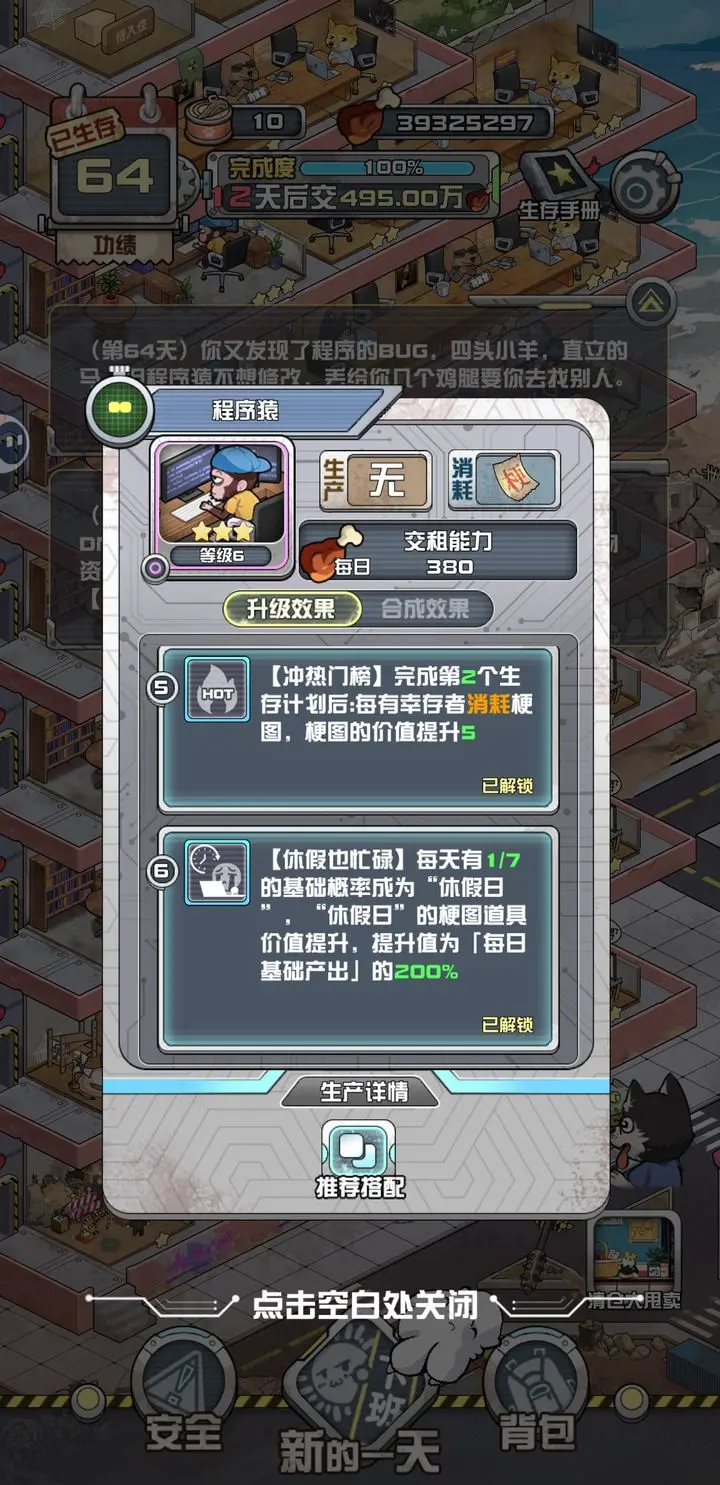 我在末日当房东手游万能通关攻略阵容:996吗喽流,其他随意,主要是程序猿和菜菜咕必须上阵。