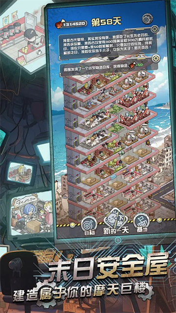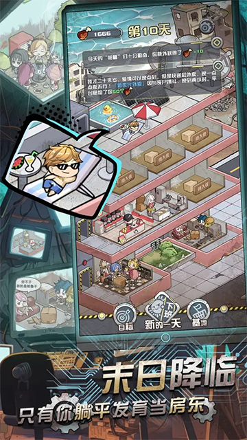 我在末日当房东是一款以末日为背景的背包肉鸽手游,玩家将进入一个充满危机的末日世界,化身为一名幸存者的房东。在这个危险的时代,你的任务不仅是为自己创造安全的栖息地,更要收留并指挥各类幸存者,组建抵抗丧尸的强大战队。每个幸存者都有不同的性格与技能,通过合理的搭配与规划,你需要在有限的空间中将他们安置在合适的房间,并通过他们的羁绊效应提升生产和战斗效率。随着游戏的推进,你将有机会建设自己的“魔天巨楼”,在这个庇护所中集结更强大的幸存者团队,突破更多的末日危机,最终在末日世界中找到自己的生存之道。