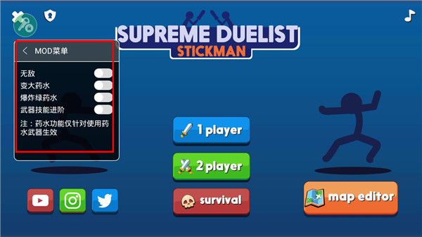 PS:本站提供的是火柴人至高对决内置作弊菜单最新版,此版本已内置作弊菜单,其中包含角色无敌、变大药水、爆炸绿药水、武器技能进阶等多项功能,可任大家随心选择开启!