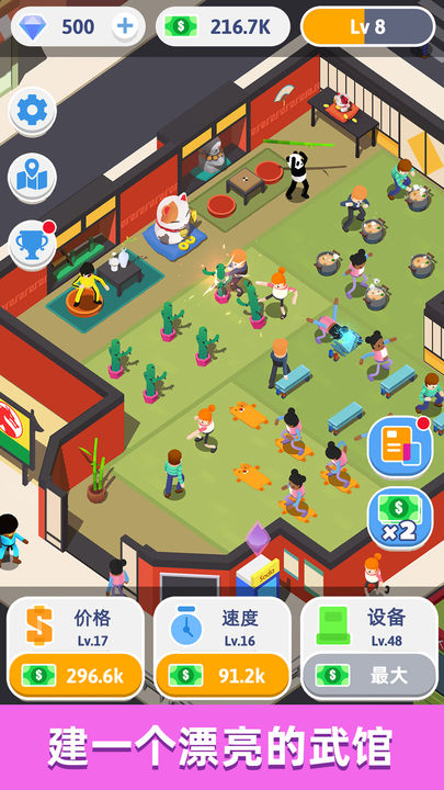 一款非常好玩的模拟经营游戏,玩家将在这里经营一家功夫道馆,从最开始的小小场地不断的发展起来,收纳更多弟子,招募专业的武术老师教导他们,放置的玩法操作简单容易上手,离线也可赚取收益。