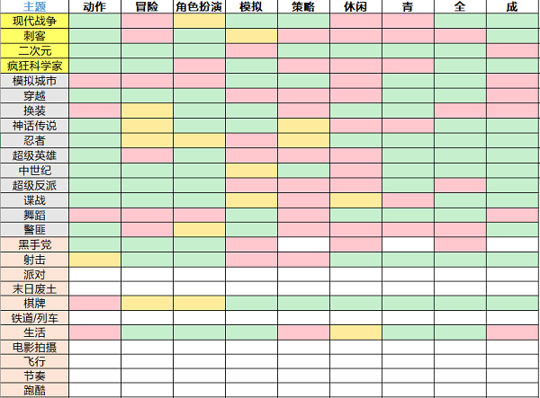 游戏开发大亨最佳搭配表,表中红色代表不可行,绿色代表完美,黄色代表中等