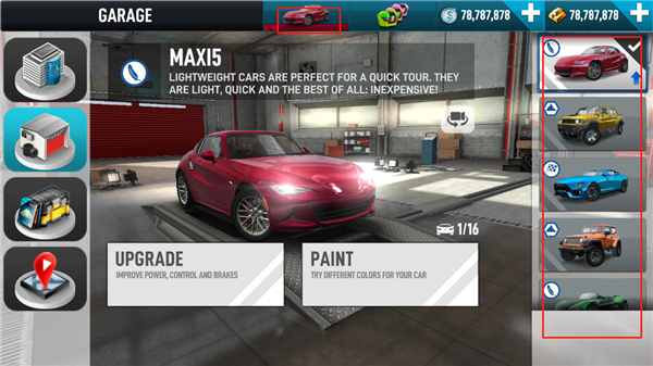 1、打开在本站下载的 进入游戏后,点击上方的汽车图案,玩家可以在右方选择你想要的车辆;
