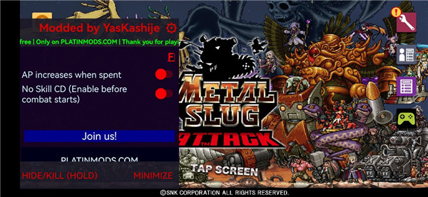 像素塔防多人联机2D合金弹头进攻是一款内容相当丰富的街机风格的策略游戏,同时相比起之前作品,这款游戏中增添了全新的游戏模式、全新的防御建筑物和部队,同时还可以统帅战队,招募熟悉的Boss角色为你而战,相信能够让你玩出不一样的风格。游戏采用顶级2D像素点绘还原游戏画风再现游戏经典原声,囊括合金弹头历代角色,同时游戏还包含多种对战玩法,在这里玩家可以尽情体验丰富有趣的策略对战。除此之外,合金弹头进攻游戏玩法操作简单,在游戏开始之后玩家将会不断的获得AP值,当AP值到达一定程度之后玩家就可以派遣出自己的士兵了,士兵登场之后会自动朝敌方的建筑物前进并对其进行进攻,当然敌人同样的也会派出士兵进行反击,而最终建筑物先被消灭的一方以失败结束游戏。PS:合金弹头进攻内置修改器版,此版本内置菜单功能,包括ap使用会增加,技能没有冷却等功能,亲测有效,喜欢的玩家还在等什么,快来下载体验一下试试看吧!