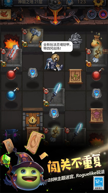 不思议迷宫是一款好玩到肝爆的roguelike类手游,游戏的背景非常简单,就是我们作为一名比较弱小的冈布奥,担任起了冒险家的角色,我们需要去冒险,游戏操作简单,只需翻开地砖,击败怪物,找到通关钥匙即可前往更深层的迷宫。在这里,每一次点击都是一次未知的尝试,或许你会在这耗尽生命,或许你会触发一次奇遇,也或许什么都不会发生。迷宫中的小怪也是经过精心设计的,森林里你会遇见野猪、猴子,村落里你会遇见强盗、屠夫;圣坛里你会遇见无生命迹象的元素怪等,每一个存在都有其合理性。其随机生成性是其一大特点,每一次进入迷宫都会随机生成场景、怪物、宝物,更遑论本就惊喜十足的彩蛋了。这就意味着,游戏相当看脸,也许在你濒危时来一个会自动远程攻击的怪物帮你补上一刀直送地狱,也许会在此刻给你一个血包让你再苟延残喘些时日,也许就给你大大的惊喜让你获得重生卷轴。