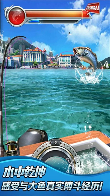 如何才能使其不断线呢?其实游戏屏幕的上方有个拉力条,拉力条将会控制玩家的节奏,在张力条的右侧,还有一个危险区域,这个区域意味着是我们拉力条的极限,当我们拉力条快到达满格的时候应该立即松手,否则鱼线就会断掉,鱼儿就会逃跑。