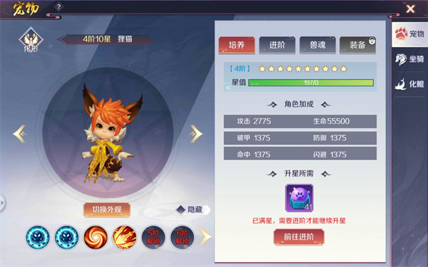 灵主达到120级之后,就可以拥有和培养自己的宠物了。大人们可以在宠物界面对宠物外观进行切换,以及培养宠物进阶、附兽魂、穿装备以此提升对角色的加成属性。拥有一个帅气可爱的宠物、走在路上回头率暴涨噢!