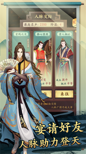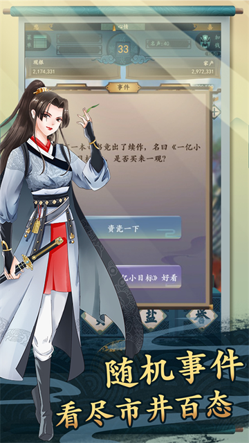 在游戏中,玩家将穿越到古代做老板,通过各种精妙的计算和买进卖出来获得不小的资金,将店铺开到全城连锁甚至外部拓展,而玩家的各类选择都会出发一个或者多个剧情故事,让游戏的结局充满谜题。作为一款经营游戏,玩家需要通过完成各种任务来获得奖励,努力让自己变得有钱有势,因此,这就需要玩家对市场的把握,玩家需要通过倒卖商品、购买房屋来积累资金,同时可攻略游戏内的NPC互动交往,待资产累计到一定程度后,就可以迎娶自己外出邂逅的那些红颜,然后生儿育女。感兴趣的话快来下载体验吧~