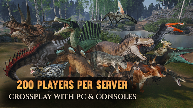每台服务器最多可容纳200名玩家,危险总是在附近。与任何人一起玩跨平台游戏,无论他们的游戏设备如何!加入一个小组以提高您的生存机会。或者,加入由数十名其他玩家组成的部落,一起聊天并协调您的下一次大冒险。