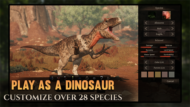 每个恐龙物种都具有独特的能力和技能,使其能够在生态系统中开辟出一片天地。食肉动物可以成群结队地捕猎更大的恐龙,而食草动物必须通过成群结队来保护自己和他们的食物来源。无论您是钓鱼的棘龙还是冲锋的始三角龙,都要充分利用您的能力求生!