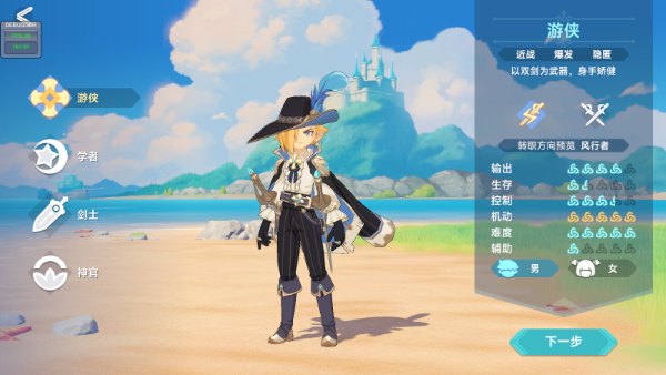 以双剑为武器,身手矫捷游侠是以双剑为武器的近战物理输出类职业,具有高爆发的特点,并且还拥有灵活的位移技能。善于隐匿的游侠可能在某个角落等候最佳时机,给予敌人致命一击。在后期,游侠玩家可以在【风行者】和【幻影游侠】之中选择更适合自己的转职方向,前者的输出更高,但是生存能力略低于后者,并且操作难度也较高。