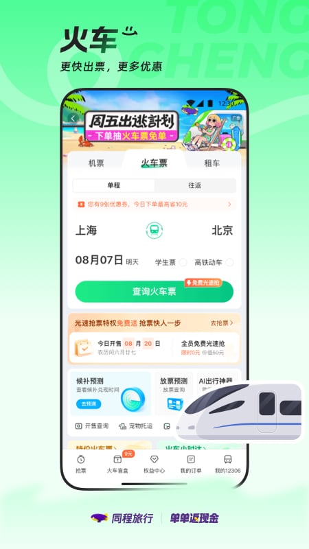 2、火车票:购票便捷,支持在线抢票、在线选座;票种多样,支持成人票、儿童票、学生票;智慧出行,智能推荐火车中转、多买几站、同车换乘等出行方式。