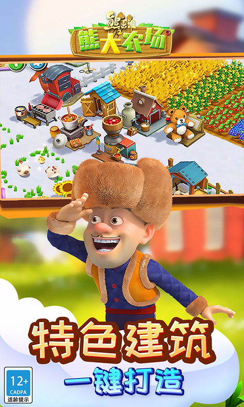 光头强化身机智农场主,熊大经营美食变帮工。时尚休闲模拟大作《熊出没之熊大农场》带你体验乐趣无限的田园生活!官方正版授权,经典角色再现,果蔬种植,萌宠饲养,建造蛋糕烤炉和风车磨坊制作出舌尖上的美食,随意扩建你的农场并把它装饰成美丽梦幻的农场庄园。小伙伴们还等什么,快来召唤好友完成高级订单,晋升鼎鼎大名的农场主!