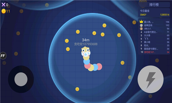 控制摇杆走位你的小蛇,吃掉地图上金币,就会变长。
