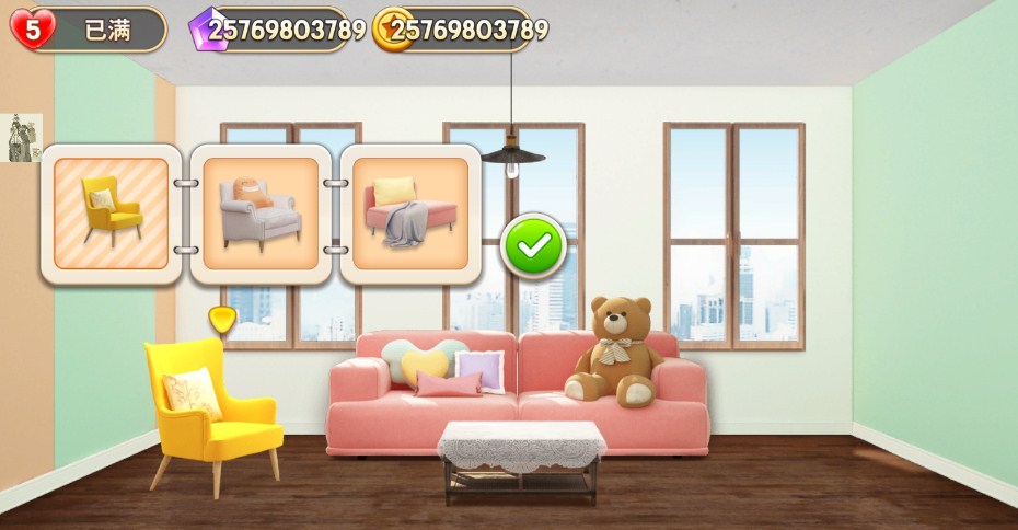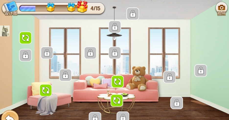 玩家可以在游戏中根据不同搭配建造房屋,让房屋从蓝图变成你美丽的小家。每一次布置房屋都需要安排任务,这样就充分利用了建造与消除之间的联系。让玩家们在建造的同时,主动去完成消除挑战任务,利用消除来获得金币和行动力,用以完成建造。