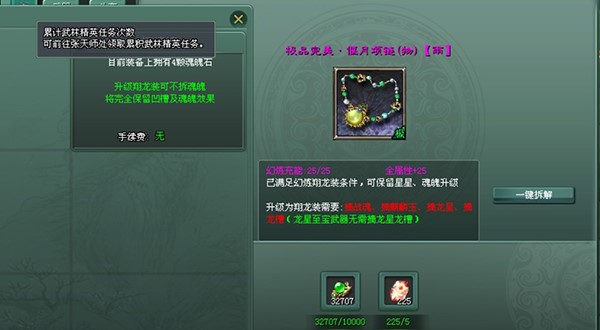 2、装备进行翔龙装炼化时,玩家需要先拆解升级装备的战魂,麒麟玉、龙星、龙槽,可通过一键拆解完成。