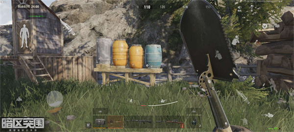 我们来到下图旁边几个不同颜色的桶。直接翻过旁边的望远镜就可以进入到瓶子和墙之间的分分析里面。然后往右边一大堆木头旁边走。