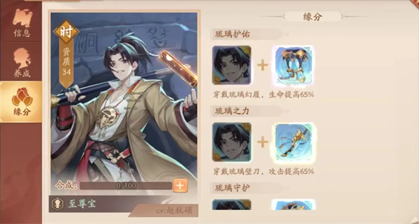 至尊宝的资质提升是显而易见的,与先前的天金时空武将相比,资质更是达到了天金+品质,以及数据面板更为强劲。在缘分上依旧是不与其他武将有关联,但与其他时空武将和主角的缘分一致,增幅均有装备引发。
