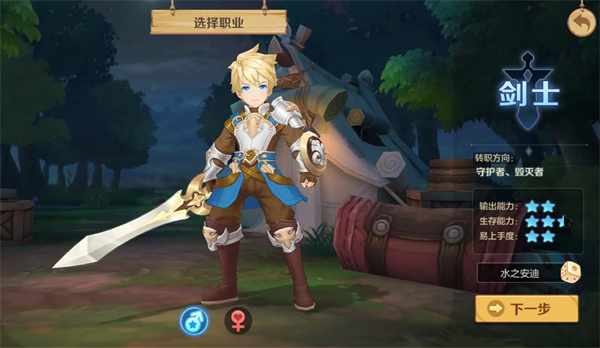 1. 剑士:剑士可以转职守护者或者毁灭者,看名字就知道他们的倾向,前者更偏向肉盾,伤害虽然低但是身板足够硬,后者自带吸血,能输出但同时身板也比较脆;