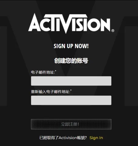浏览器搜索动视(Activision)官网,注册页面点击创建账号,输入自己的电子邮箱