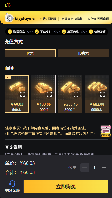 不过在游戏中,很多武器装备是需要使用金砖购买的,玩家可以自行充值或者去第三方渠道充值,但是海外游戏的充值往往会比较麻烦,不仅需要外国的手机号、信用卡等,还需要使用梯子方能进入,这些限制使得很多玩家无法快速对峙2手游的充值,所以推荐大家使用代充平台进行充值。