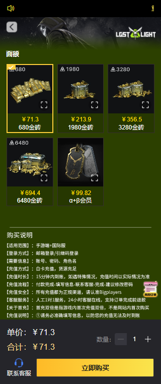 萤火突击国际服充值教程1、点击上面链接,进入萤火突击国际服代充网页,选择想要充值的面额以及数量之后,点击立即购买;
