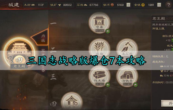 三国志战略版爆仓7本方法一、爆仓升本指南1、6级仓库需要完成8-10章任务4个资源民居7级,仓库6级,征兵处3级,军舍 点将台提升1级,4个兵战3级建好完成任务不领奖励石头的,完成以上建筑后屯田5级石头将仓库石头屯满就可以一次性领完升7本,前提你开荒不能翻车不能高损不然会断兵影响爆仓!2、7级仓库需要9章到11章任务完成不领奖励石头的,4个资源民居7级,仓库7级,征兵处4级,军舍 点将台提升1级,4个兵战3级完成以上建筑后屯田5级石头将仓库石头屯满就可以一次性领完升7本,前提你开荒不能翻车可以高损一两次不然会断兵影响爆仓!3、8级仓库需要10章任务留一个一万石头的任务完成不领,第二天的试炼有石头先不打等仓库石头满,或者自己屯满但是我不建议相差太多屯满,因为这样太浪费策书,会导致后面你开6没足够的策书屯田升军营征兵,除非你开个6石头屯最好!4个资源民居7级,仓库8级,征兵处4级,军舍 点将台提升1级,4个兵战5级(也可以3级)完成以上建筑后屯田5级石头将仓库石头屯满就可以一次性领完升7本。推荐8级仓库爆仓升7本!开6级地4个兵战是必须5级的不然战损不稳定,卡四本不用急着升5本做任务把仓库4个资源民居5级以及完成打地的任务就能直接5本!后面大家发现升8本 12级仓库的话还差1万6000石头的仓库容量才够,但是升1级仓库又觉得浪费资源没必要,可以在那天凌晨零点刷新式炼场,留着等12级仓库屯满石头就打试炼场爆仓升8本!记得木材铁矿就差几万再屯满石头或等石头满才打试炼场爆仓升8本!,如果当天试炼场没那关奖励石头,那就只能老老实实13级仓库了!二、领地建筑如何安排领地建筑包含:造币厂 工坊 虎帐 仓库 乐府,一般5个造币厂 3个工坊 1个虎帐 1个乐府,如果感觉自己铜矿产量低可以考虑6个造币厂不建乐府,工坊一般是开了每个7级地有个屯田除了石头的另外7级地建。8本之前建2个3级工坊,8本后再1个3级工坊,后续九本4资源20级17级军营满御,可再建一个3级工坊,可以第7天最后时间将4个工坊升到4级,等10本之前建筑必要的都满了就可以考虑工坊满级,虎帐等后面木材铁矿粮食产量破10万以后考虑建。S3赛季开始小型军屯与大型军屯跟自己产量情况选择建优先石头,占的领地产什么资源就是对应产什么的军屯,3级地建小型军屯相当于5级地,4级地建大型军屯相当于6级地!一般到了资源州没什么地了打了考虑或者发育慢的小伙伴优先考虑补发育,大型军屯需要名声达到11000才能占4级地建,而小型军屯开启就能建!前期开荒建筑跟着任务,分城第3天禁田期可以建,最好等15000势力放5级地建分城,当然快15000势力也行!分城建好随便在分城上阵武将把兵分配给这个武将再下阵重复直到分城的兵没了,这是换回一点资源,再拆分城等25000势力再建分城,这样做的好处是能帮你破2万势力或25000势力顺利!一般前期不建军屯!