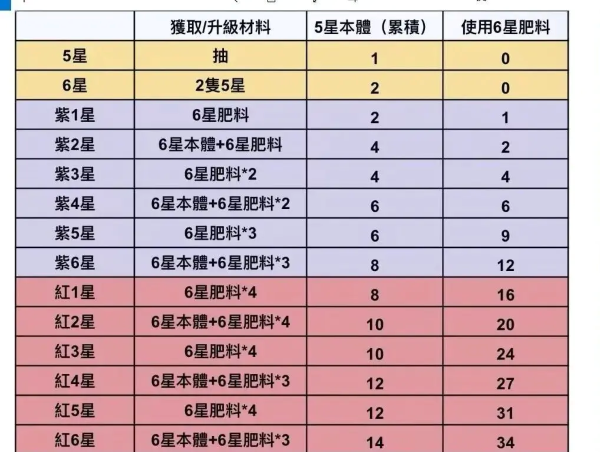 首先附上角色升阶的本体和狗粮消耗明细图。
