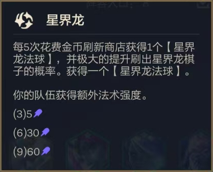 激活星界龙羁绊之后每五次花费金币(棱彩门票等免费刷新不算)的商店刷新会获得一个星界龙法球,并极大的提升刷出星界龙棋子的概率。