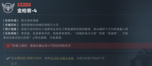 【任务目标】:在任意机密/绝密行动中,使用【SCAR-H战斗步枪】,击败3名敌方特战干员;