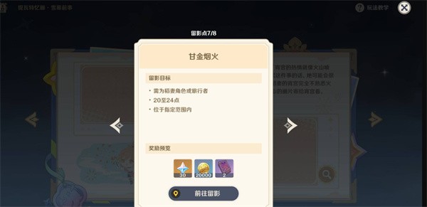 一、前置条件 完成活动前置任务后,获取【派蒙的留影机】道具。在背包的小道具页面中,将留影机装备到快捷栏。 二、留影点1:甘金烟火 1、进入活动页面,点击【查看详情】,找到【甘金烟火】,点击【前往留影】。